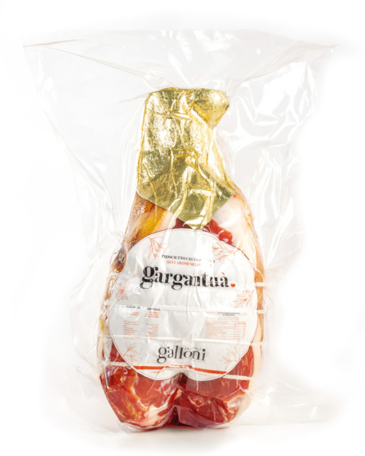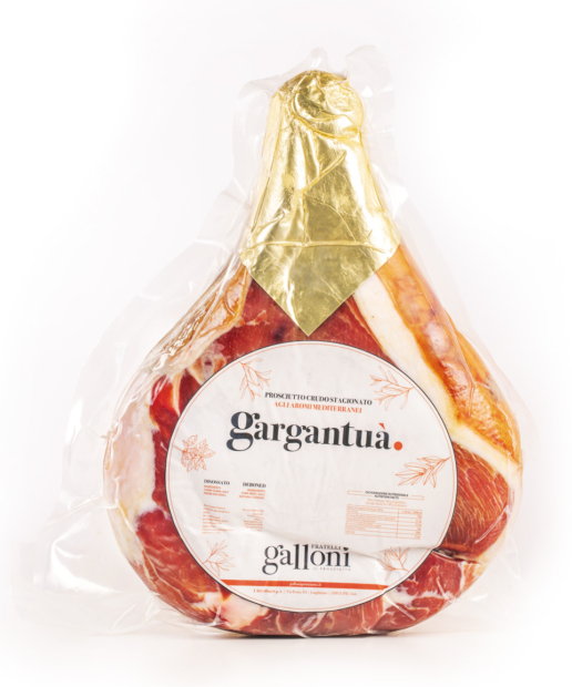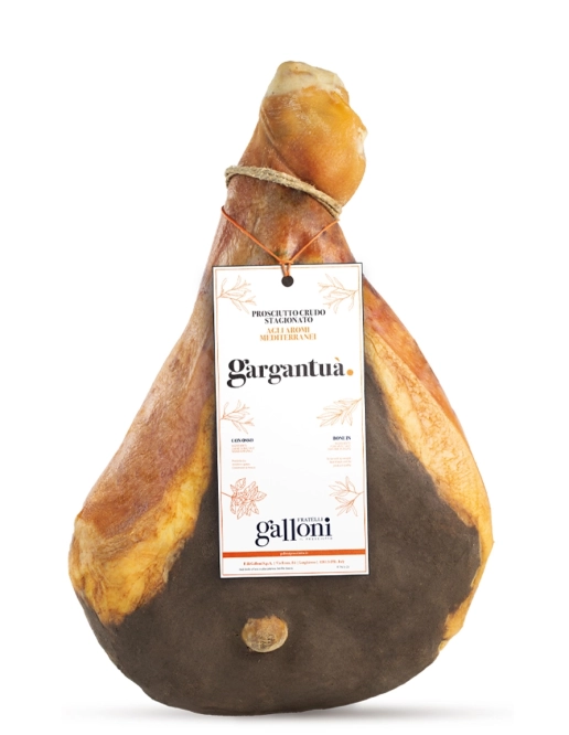 Dall'antica ricetta di Fratelli Galloni nasce Gargantuà, un Prosciutto crudo stagionato su legno e lavorato esclusivamente a mano dall’aroma mediterraneo intenso e dal colore brillante. Il Prosciutto Gargantuà spicca infatti fra le specialità Galloni per sapori e bouquet aromatici straordinari. La provenienza delle carni è rigorosamente italiana. La salagione di questo prosciutto si effettua manualmente utilizzando una miscela di sale marino, aromi e spezie naturali, preparata direttamente dai nostri mastri salatori. La stagionatura, che inizia dal sesto mese, avviene all’aria naturale delle cantine e dura almeno 17 mesi. Nelle ultime settimane i prosciutti vengono spostati in stanze dedicate, con una temperatura media più elevata per aiutare il grasso ad ammorbidirsi, in un processo che dona alle carni un profumo intenso e un sapore morbido e vellutato. La particolare consistenza della parte magra rende il prodotto ideale anche per il taglio a coltello.La realizzazione del prosciutto del Gargantuà è legata a uno studio interno sulla migrazione degli aromi nelle carni. Questo ha consentito l’uso distinto di alcune spezie su specifiche parti muscolari per un risultato percettivo armonico e calibrato.