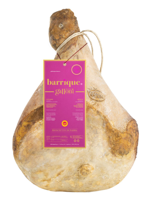 Limitata produzione di Prosciutti Parma, affinati in botti di rovere originariamente utilizzate per l’invecchiamento di Barolo e Nebbiolo. Il prosciutto Galloni in Barrique viene inserito in botte al 18° mese di stagionatura e vi resta per circa 6 mesi. Il graduale affinamento in questa particolare camera, ricca di lieviti aromatici del vino, completa la stagionatura e conferisce al prosciutto un delicato sentore fruttato che ne esalta le caratteristiche organolettiche. Il risultato è un crudo elegante e raffinato, dall’aroma dolce, con lievi note floreali e di sottobosco, una particolare esperienza per i palati più sofisticati ed esigenti che vogliono esplorare nuove armonie di profumi e sapori.