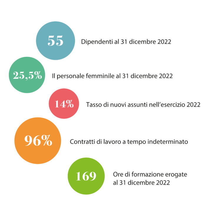 55 dipendenti nel 2022 (+8%rispetto al 2021), di cui 96% atempo indeterminato